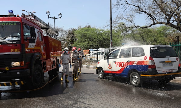 Fire officers spray disinfectant on a police vehicle in New Delhi, India, on April 2, 2020.Manish Swarup/The Associated Press