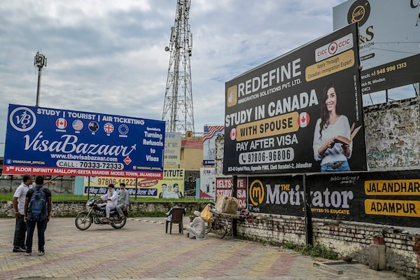 Billboards advertise study abroad programs that provide visas, in Jalandhar, India, in the northern state of Punjab, on Sept. 23.ATUL LOKE/The New York Times News Service