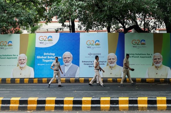 Police officers walk past posters with the picture of India's Prime Minister Narendra Modi on the first day of the G20 summit in New Delhi, on Sept. 9.FRANCIS MASCARENHAS/Reuters