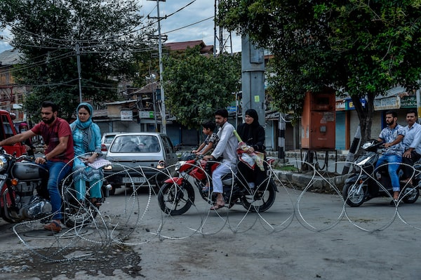 People navigate scooters through barbed wire on Aug. 11, 2019, in Srinagar, where the government's recent intervention has drawn comparisons with China's clampdown in the western Xinjiang region.Atul Loke/The New York Times News Service