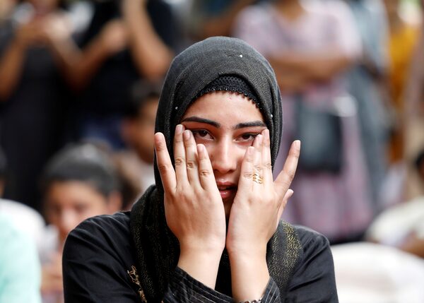 A woman wipes her tears from her cheeks while listening to a story on Aug. 12, 2019, during a gathering to observe Eid al-Adha, away from her home in Kashmir.ANUSHREE FADNAVIS/Reuters
