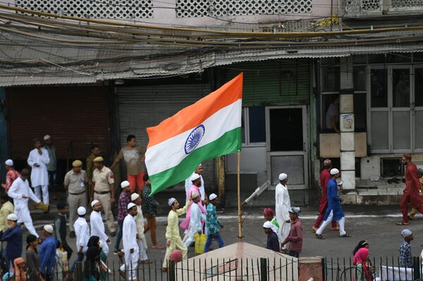 Muslim devotees walk past an Indian national flag after offering Eid al-Adha prayers at Jama Masjid in New Delhi on Aug. 12, 2019.MONEY SHARMA/AFP/Getty Images