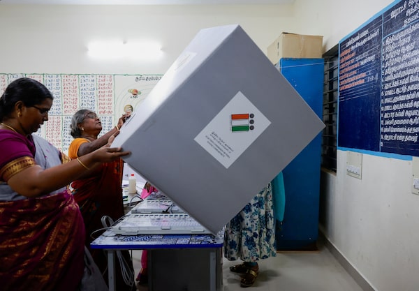 Polling officials work to set up a polling station at a school, a day ahead of the first phase of the election, at Tiruvannamalai in Tamil Nadu, India, on April 18.Navesh Chitrakar/Reuters