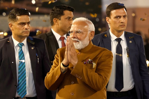 Indian Prime Minister Narendra Modi gestures at the Bharatiya Janata Party (BJP) headquarters as BJP celebrates its win in the Delhi state assembly elections, in New Delhi, India, on Feb. 8.Adnan Abidi/Reuters