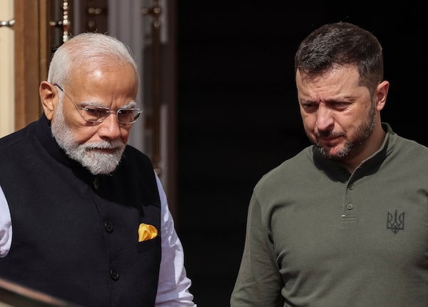 Ukrainian President Volodymyr Zelensky, right, meets with Indian Prime Minister Narendra Modi, in Kyiv, on Aug. 23.Gleb Garanich/Reuters