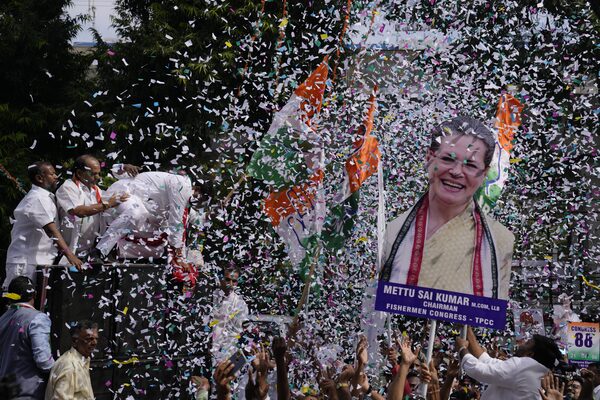 Supporters of India's main opposition party, Indian National Congress, display a cutout photo of their leader Sonia Gandhi, as they celebrate early leads for their party in Telangana state elections in Hyderabad, India, on Dec.3.Mahesh Kumar A/The Associated Press