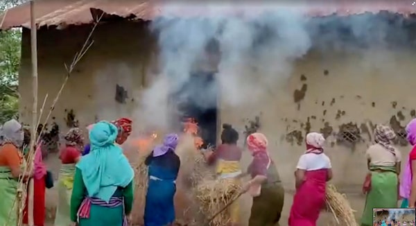 Women put burning hays in a house of the accused in viral Manipur video case, in Pechi Awang Leikai, Manipur, India, on July 20, in this screengrab obtained from a Handout video.ASIAN NEWS INTERNATIONAL/Reuters