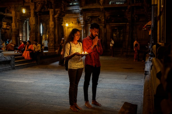 A couple prays as they mark Diwali at a Hindu temple in Colombo, Sri Lanka, on Oct. 24.Eranga Jayawardena/The Associated Press