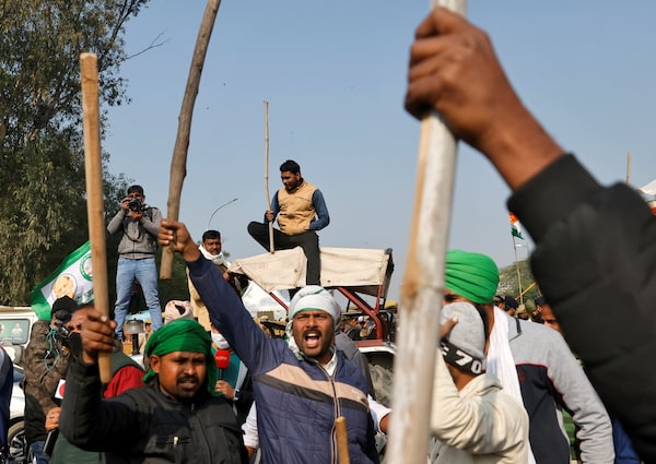 Farmers block a road during a protest against farm bills passed by India's parliament, on the outskirts of Delhi, India, on Dec. 16, 2020.DANISH SIDDIQUI/Reuters