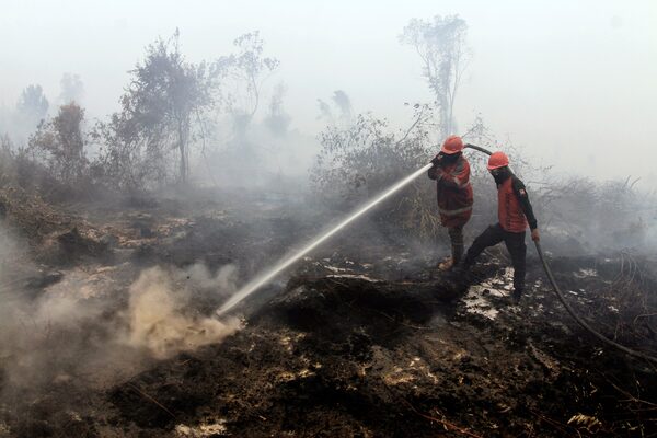 Firefighters spray water to extinguish a forest fire in Kampar, Riau province, Indonesia, on Sept. 18, 2019.Rafka Majjid/The Associated Press