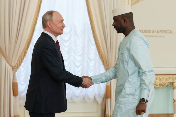 Russia's President Vladimir Putin shakes hands with Mali's President Assimi Goita during a meeting following the Russia-Africa summit in Saint Petersburg, Russia, in July, 2023.TASS/Reuters