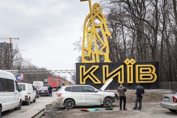 A damaged car sits on the road leading to Kyiv on March 7. The capital and its environs have come under heavy Russian bombardment since the invasion began on Feb. 24.Anton Skyba/The Globe and Mail