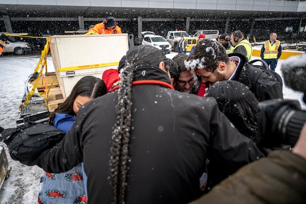 Those who travelled on the plane with the artifacts and Steven Guilbeault embrace following the offloading process.Andrej Ivanov/The Globe and Mail