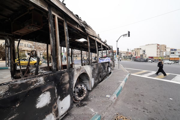 The wreckage of a burnt bus bearing a banner that reads 'This was one of Tehran's new buses that was paid for with the money of the people's taxes,' in Tehran's Sadeghieh Square on Jan. 15.ATTA KENARE/AFP/Getty Images