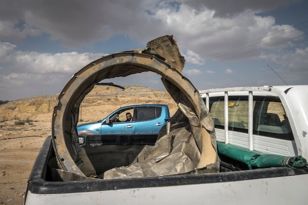 Pieces of an Iranian missile in a pickup truck outside Arad, Israel, on April 14, 2024.SERGEY PONOMAREV/The New York Times News Service