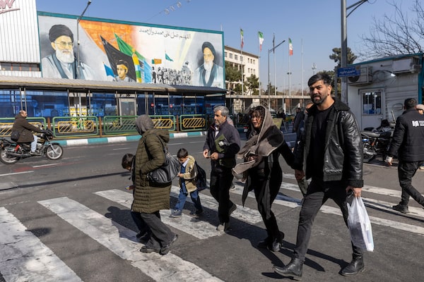 Iranians walk along a sidewalk on Enqelab-e-Eslami Street in downtown Tehran with a mural of Ayatollah Khamenei and Ayatollah Khomeini in the background on Sunday.Majid Saeedi/Getty Images