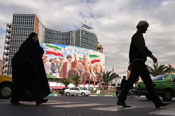 Commuters make their way past a giant billboard of slain Iranian supreme leader Ayatollah Ali Khamenei at the Valiasr Square in Tehran on Sunday.ATTA KENARE/AFP/Getty Images