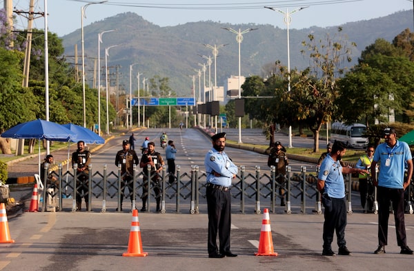 Police officers stand guard near the Serena Hotel, the venue for expected U.S.-Iran talks, in Islamabad's Red Zone, on Saturday.Asim Hafeez/Reuters