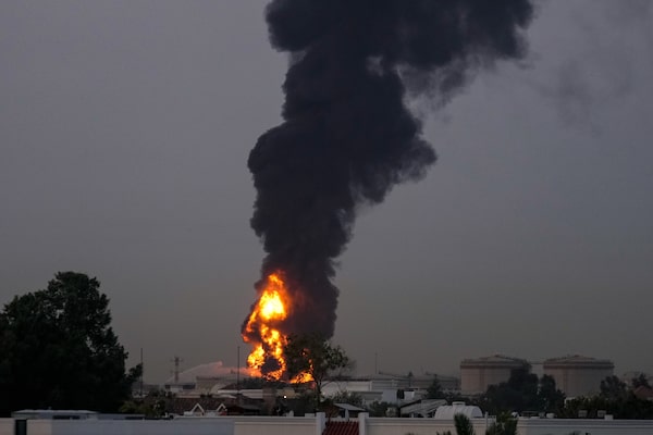 Fire and plumes of smoke after a drone struck a fuel tank forcing the temporary suspension of flights near Dubai International Airport on Monday.Uncredited/The Associated Press