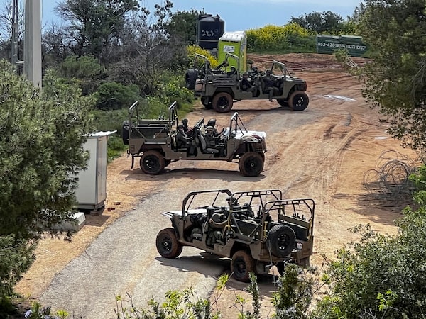 Israeli soldiers in military vehicles on the Israeli side of the Israel-Lebanon border, on Monday.Avi Ohayon/Reuters