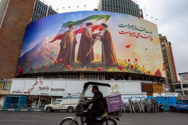 A banner displayed at Valiasr Square in central Tehran on Tuesday, depicting Iran's late supreme leader Ayatollah Ruhollah Khomeini, left, watching as his successor the late Ayatollah Ali Khamenei, centre, hands over a national flag to his son and new supreme leader Mojtaba Khamenei.-/AFP/Getty Images