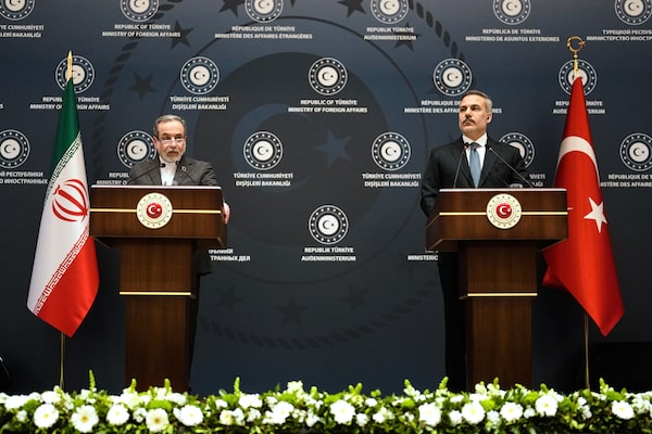 Turkish Foreign Minister Hakan Fidan, right, and his Iranian counterpart Abbas Araghchi in Istanbul, Turkey on Friday.Khalil Hamra/The Associated Press