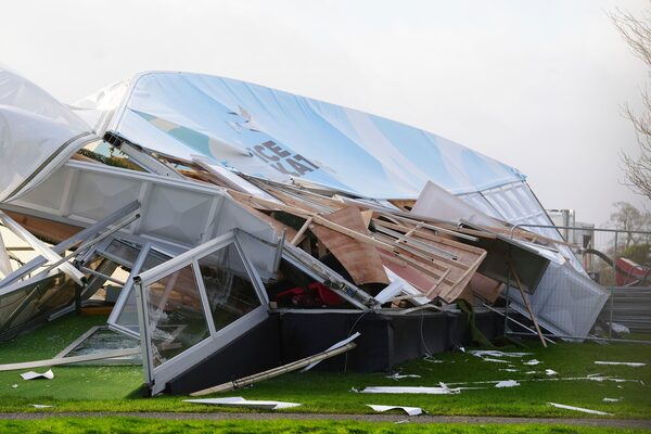 The remains of an ice skating facility on Jan. 24 after strong winds tore the structure apart in Ireland.Brian Lawless/The Associated Press