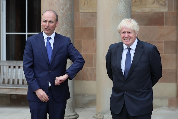 British Prime Minister Boris Johnson, right, greets Irish Prime Minister Micheál Martin at Hillsborough Castle, in Belfast, on Aug. 13, 2020.BRIAN LAWLESS/AFP/Getty Images