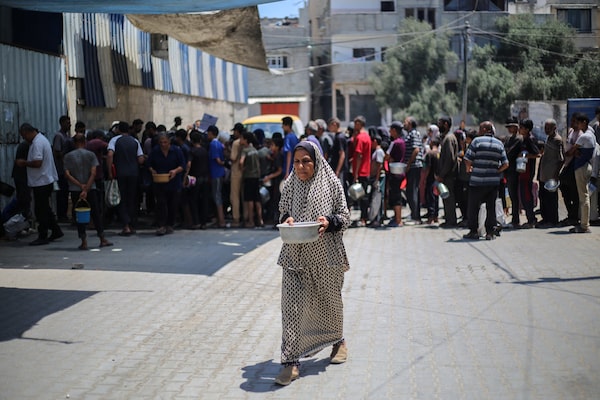A Palestinian woman collects a hot meal at a food distribution point in Nuseirat in the Gaza Strip on Monday.EYAD BABA/AFP/Getty Images