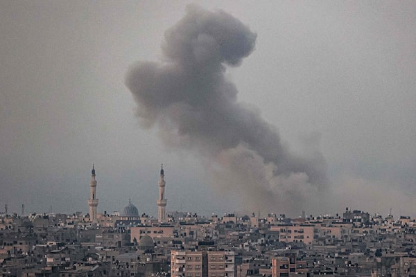 A smoke plume billows after Israeli bombardment in Rafah in the southern of Gaza Strip on Oct. 28, 2023 amid the ongoing battles between Israel and the Palestinian group Hamas.SAID KHATIB/AFP/Getty Images