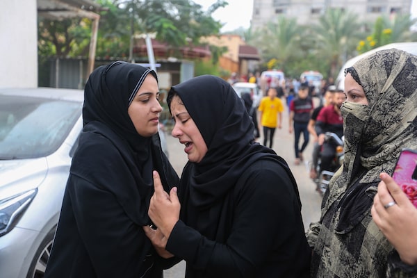 People mourn as they collect the bodies of Palestinians killed in Israeli air raids on October 28, 2023 in Khan Yunis, Gaza.Ahmad Hasaballah/Getty Images