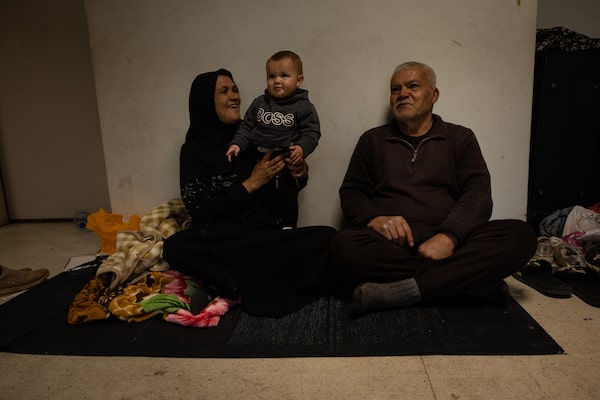 Mohammad Hussein Aboud sits with his wife and son in the corridor of the Bir Hassan Technical Institute.Oliver Marsden/The Globe and Mail
