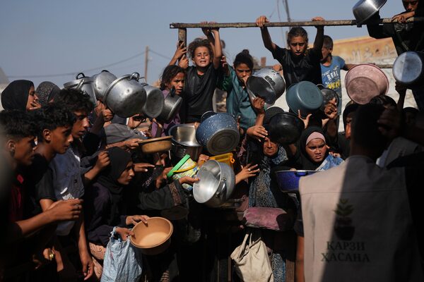 Palestinians wait to get donated sugar and rice at a community kitchen in Khan Younis.Abdel Kareem Hana/The Associated Press