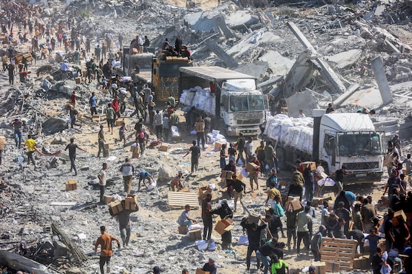 Palestinians collect aid supplies from a truck amid a ceasefire between Israel and Hamas, in Khan Younis, in the southern Gaza Strip, on Sunday.Ramadan Abed/Reuters