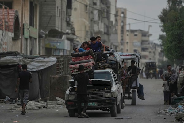 Displaced Palestinians fleeing with their belongings in Gaza City on Tuesday.Jehad Alshrafi/The Associated Press