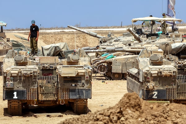 Israeli army tanks near the border with the Gaza Strip in Israel on Wednesday. Israel’s military has called the evacuation of Gaza City ‘inevitable’ ahead of a new offensive.JACK GUEZ/AFP/Getty Images