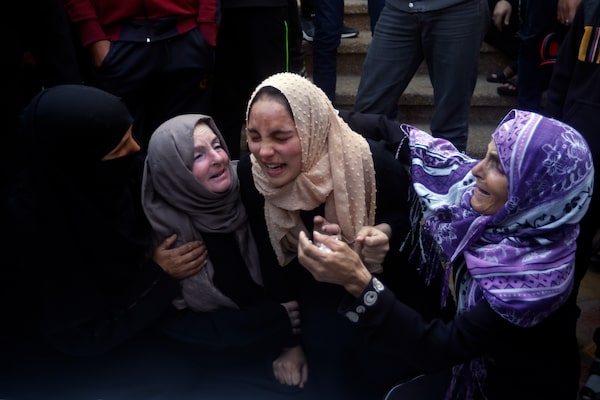 Palestinians mourn relatives killed in an Israeli bombardment of the Gaza Strip, outside a morgue in Kahn Younis on Dec. 11.Mohammed Dahman/The Associated Press