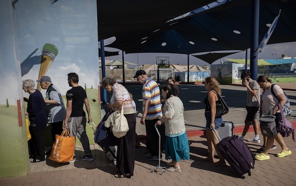 Israelis walk towards a bus to evacuate from Sderot on October 15, 2023. The Globe and Mail/Goran TomasevicGORAN TOMASEVIC/The Globe and Mail