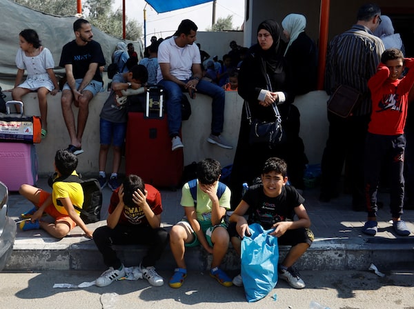 Palestinians with dual citizenship wait outside Rafah border crossing with Egypt in the hope of getting permission to leave Gaza, on Oct. 14.IBRAHEEM ABU MUSTAFA/Reuters