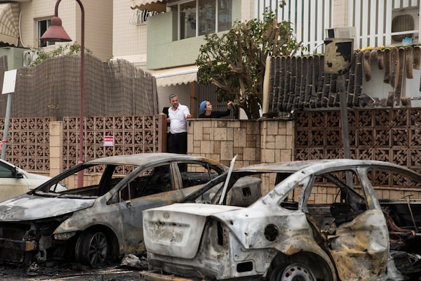 A man looks at a scene of burned cars after a rocket fired from the Gaza Strip landed in the street.Amir Levy/Getty Images