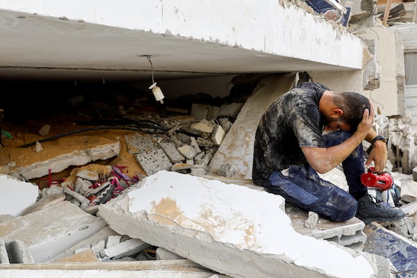 A rescuer reacts as he works with others to remove Palestinian casualties from under the rubble of a house destroyed in Israeli strikes, in Rafah in the southern Gaza Strip.IBRAHEEM ABU MUSTAFA/Reuters