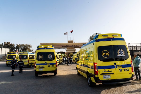 Ambulances and medical personnel amass at the Rafah border crossing waiting to cross from Egypt into Gaza.Ali Mustafa/Getty Images