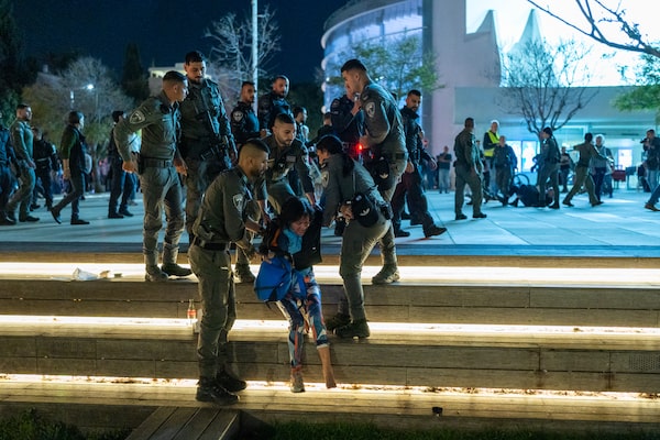 Anti-war protestors clash with security personnel as they gather in Habima Square in Tel Aviv on Saturday. A new Iran war poll by the Israel Democracy Institute (IDI) surveyed 756 adults from March 22 to 26.Erik Marmor/Getty Images
