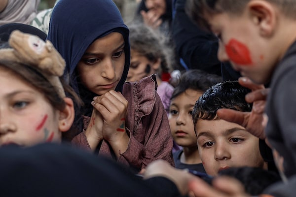 Displaced children queue to get toys at a shelter in Tyre, south Lebanon on Tuesday.Louisa Gouliamaki/Reuters