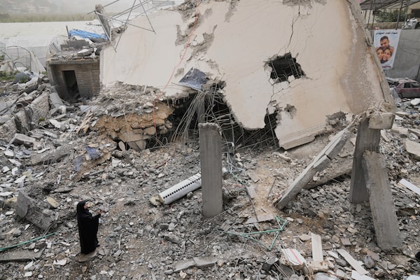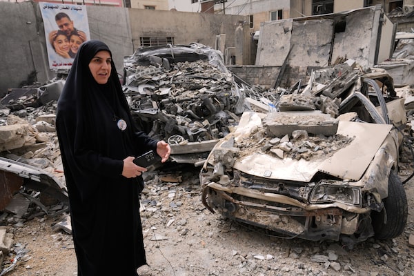 Malak Meslmani, the mother of Jawad Younes, who was killed on March 27, speaks at the site where her son was killed in an Israeli air strike in Saksakieh village, south Lebanon on April 3.Hussein Malla/The Associated Press