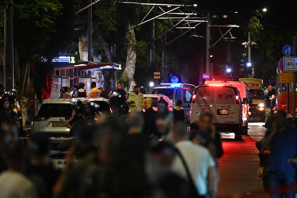 Emergency services are seen near the site of a shooting by gunmen at a light rail station on Oct. 1, 2024 in Tel Aviv, Israel.Leon Neal/Getty Images