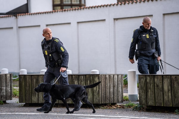 Danish police officers are seen securing an area near the Israeli embassy in Copenhagen, on Oct. 2, 2024 after two blasts that went off in an area near the Israeli embassy in the capital.EMIL NICOLAI HELMS/AFP/Getty Images