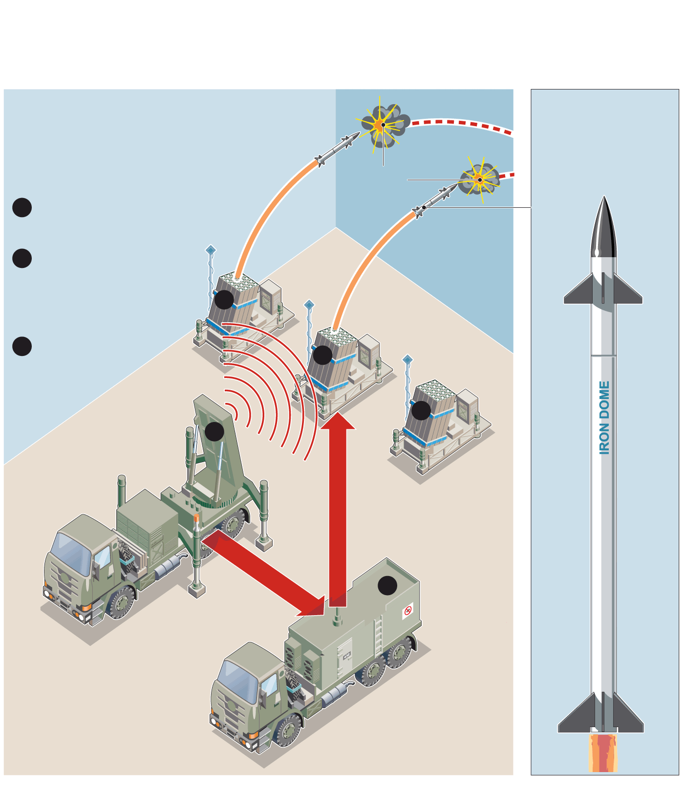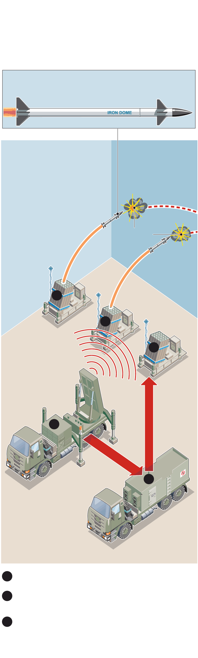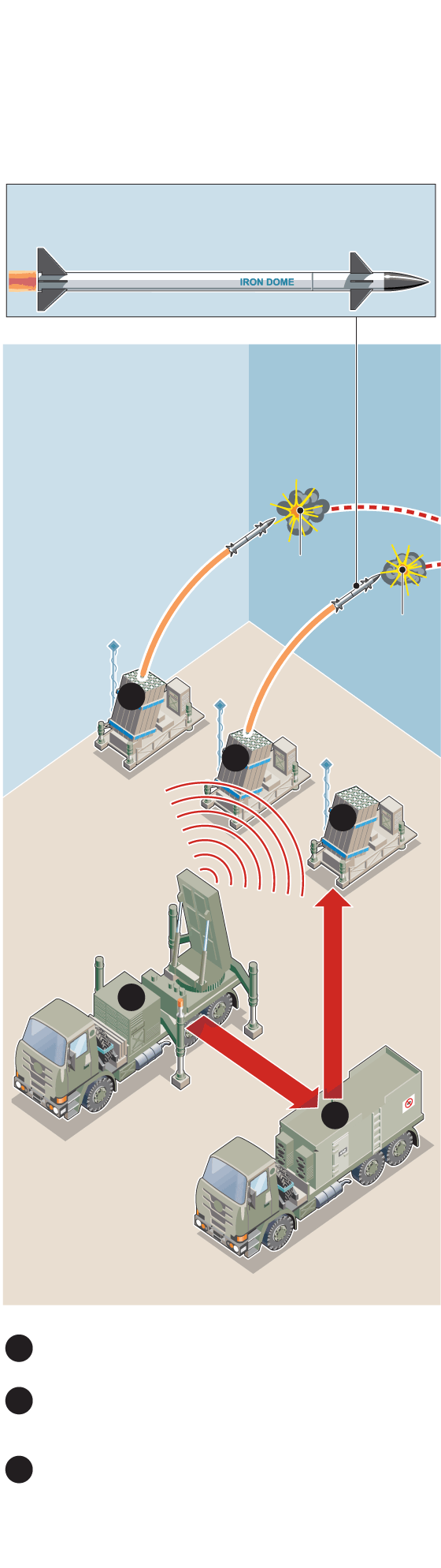 Designed to intercept short-range rockets fired from up to 70 km away, as well as mortars, artillery shells and drones, Iron Dome consists of radar, a control centre and launchers.