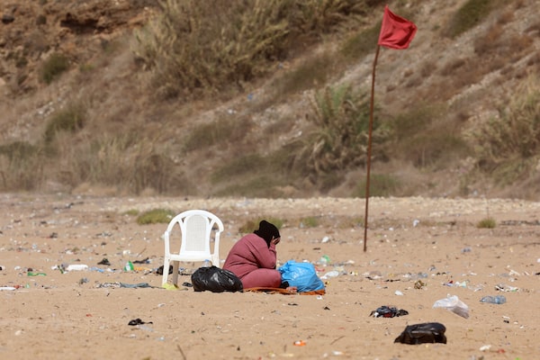 A displaced woman sits at Beirut's Ramleit al Baida beach turned into a makeshift refugee camp, on Oct. 1, 2024. Intense Israeli attacks may have forced up to a million people to flee parts of Lebanon in possibly the worst displacement crisis in the tiny country's history, Lebanon's Prime Minister Najib Mikati said on Sept. 29.PATRICK BAZ/AFP/Getty Images