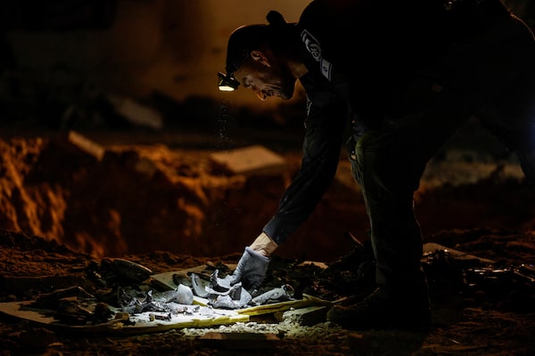 A member of Israeli rescue force inspects the site where a missile fired from Iran towards Israel hit a school building, in central Israel, Oct. 1, 2024.Amir Cohen/Reuters